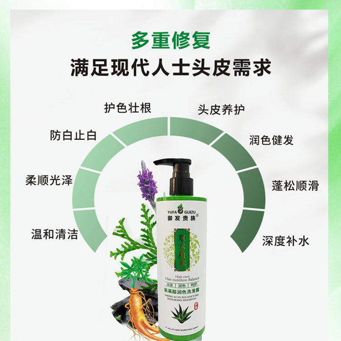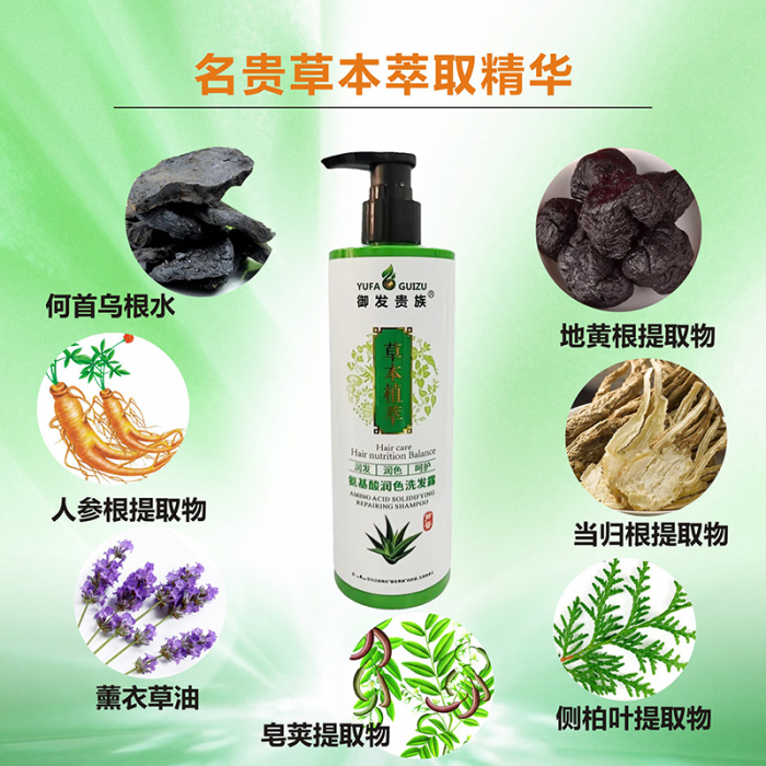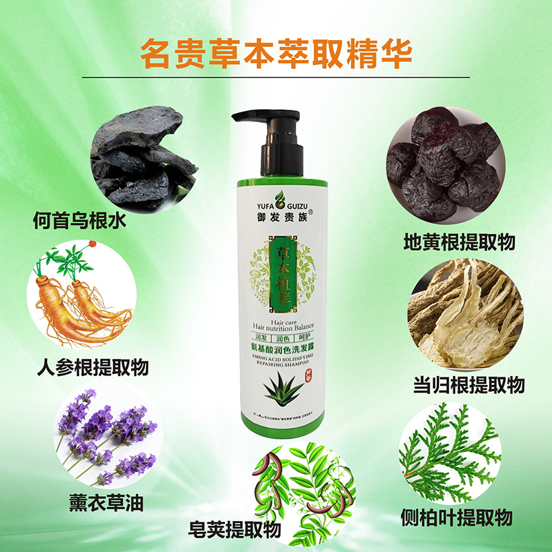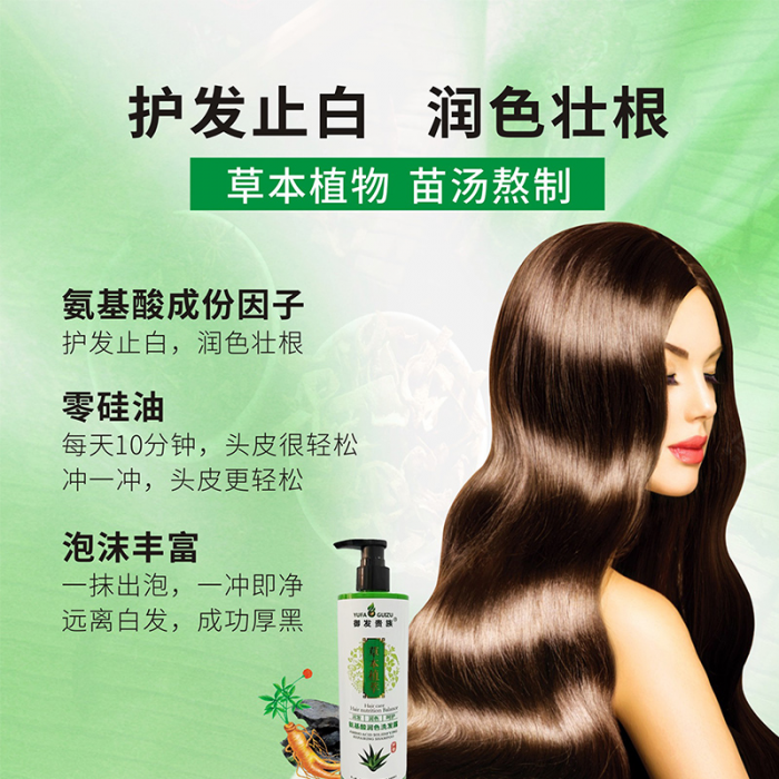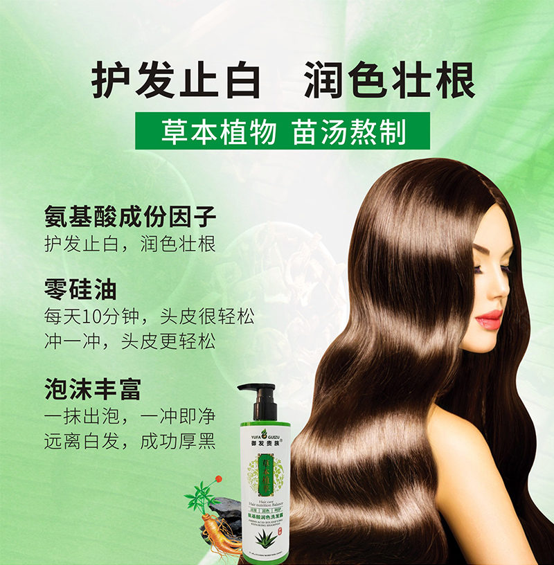 氨基酸润色洗发露,净含量350毫升,主要体现为防白护色,零硅油,温和滋养,弱酸性呵护头皮,减少毛躁,泡沫丰富,通过中草药草本植物精华内含氨基酸因子供发养份,蕴含:人参,薰衣草油,何首乌,地黄根,侧柏叶,当归,皂荚,地肤子,墨旱莲,茶麸,藏红花,白芷等,众多中草药草本植物精华提炼熬制而成,适合大众化的白发者,头发干枯,分叉,无光泽的人群,头皮好,头发才会好,不染,从根养,一抹出泡,一冲即净,冲一冲,头皮更轻松,帅哥,美女们,如果你因为生活习惯不好和工作压力过大而造成出现的白发,头屑,头痒,头油等情况,强烈建议你使用这一款氨基酸润色洗发露,养头皮,不伤发,头发更健康,